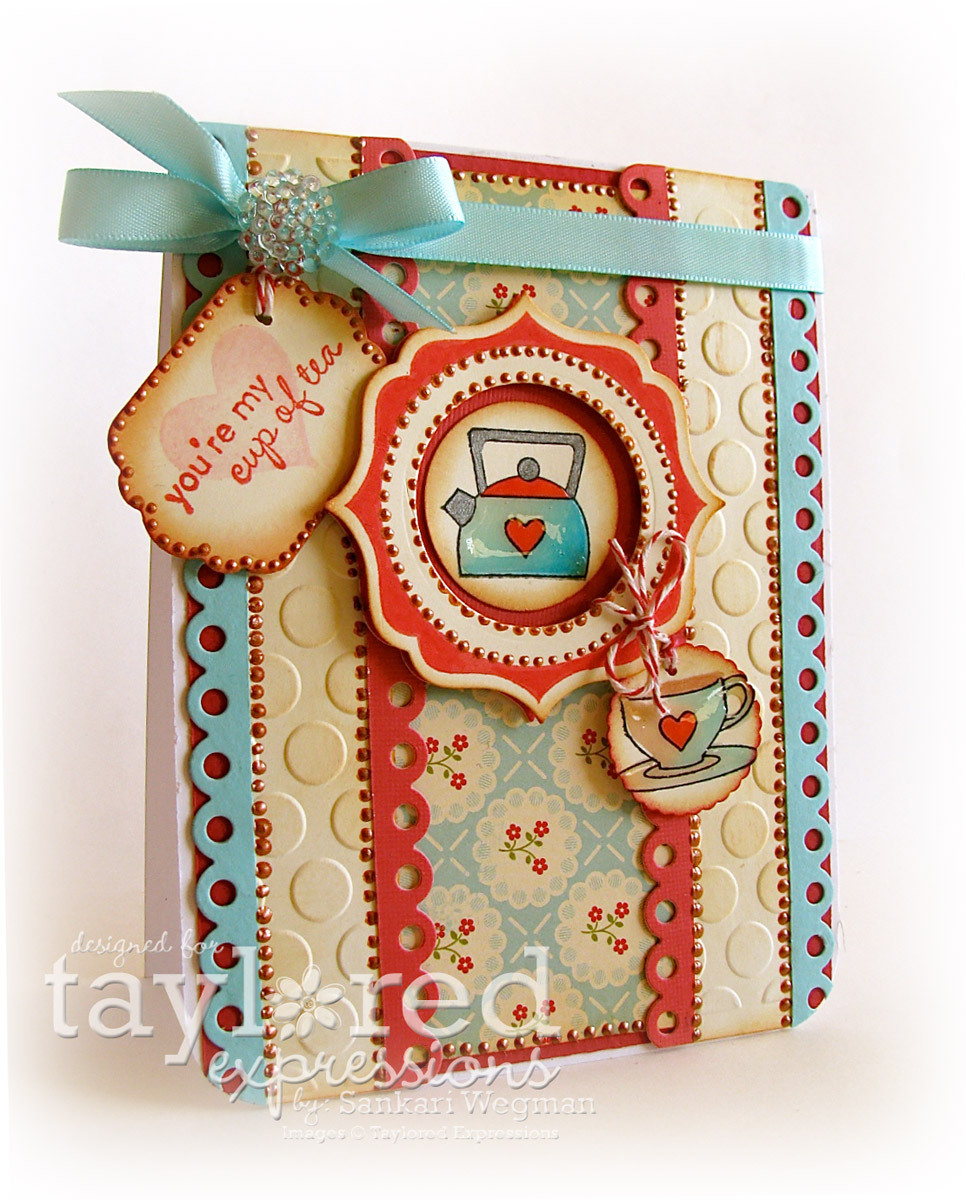 Accessories: Taylored Expressions From the Heart Frame and Scalloped Eyelet Border die, Scalloped Sparklers (Blue), Baker's Twine Sampler, copics, Dimensional Pearls (Adirondacks) Terra Cotta, Cuttlebug embossing folder, Glossy Accents (glaze), Caribbean Satin ribbon, EK success slim edger punch (open scallop), corner rounder and dimensionals. Airtight jar for the tea powder.
